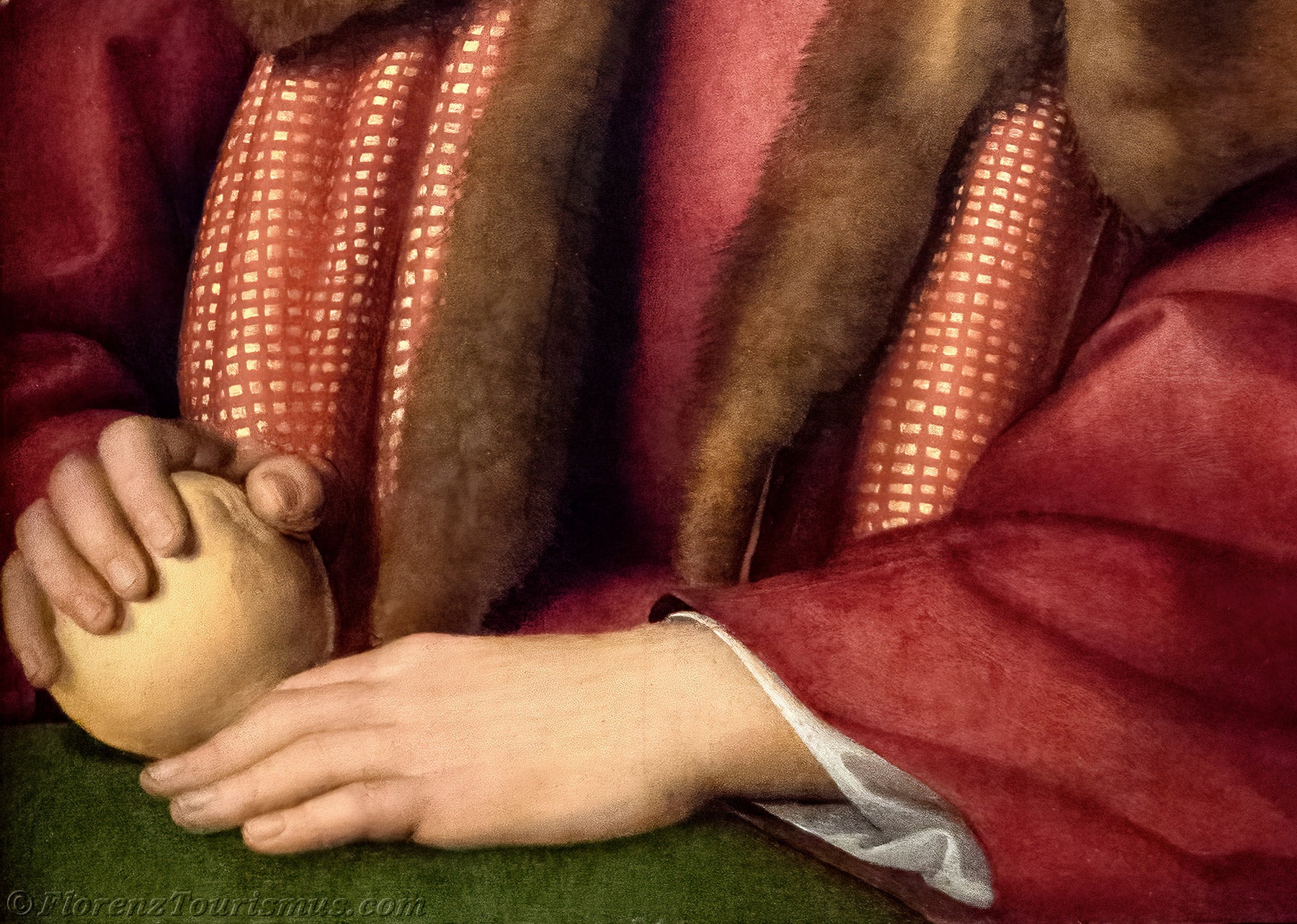 Der Apfel, den der junge Mann in seiner rechten Hand hält und der hier von Raffael dargestellt wird, soll eine Anspielung auf den goldenen Globus der Macht sein, der Francesco Maria della Rovere zufallen wird, wenn er Herzog von Urbino wird.